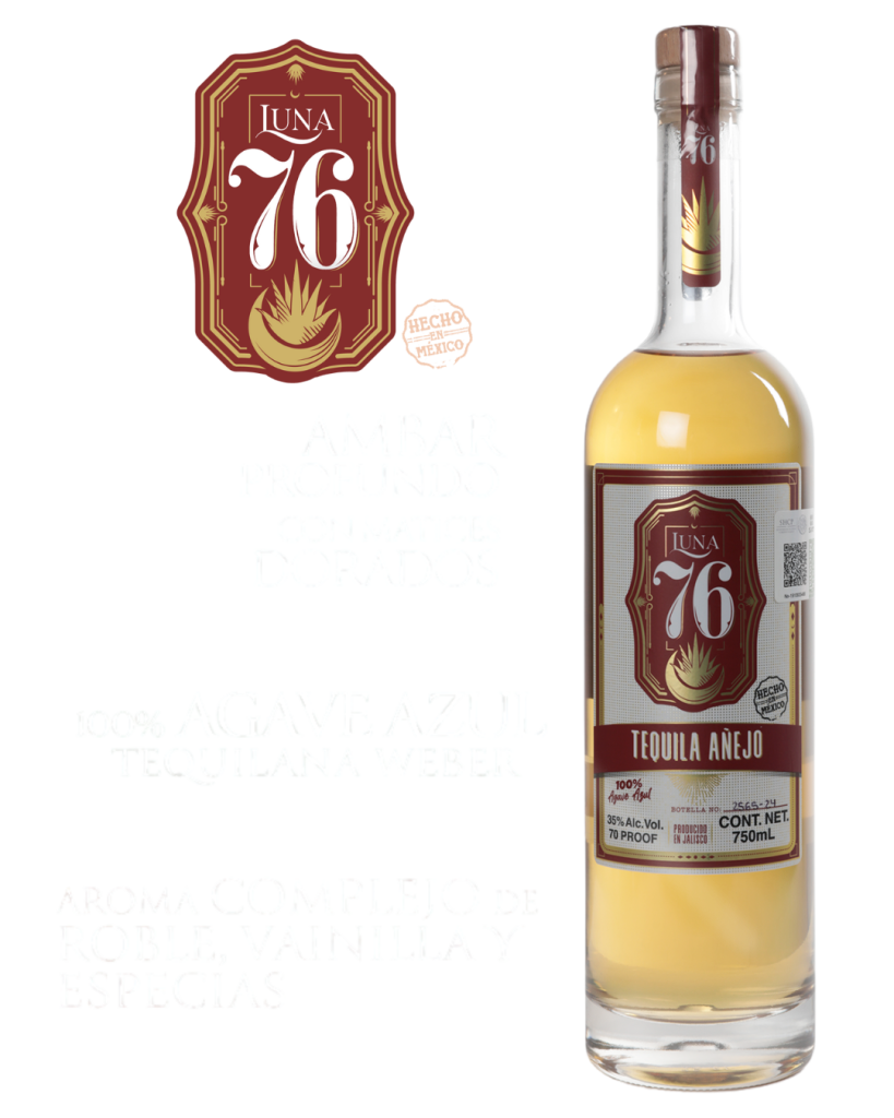 Tras su destilación en alambiques de cobre, LUNA 76 Añejo reposa durante 12 meses en barricas de roble, donde cada día aporta matices, profundidad y carácter. Este añejamiento otorga al tequila un perfil refinado, con un equilibrio impecable entre suavidad y complejidad. Su color ámbar profundo, con delicados reflejos dorados, recuerda la calidez del atardecer y la riqueza de la tierra que lo vio nacer. Su aroma revela un bouquet envolvente: notas de madera tostada, vainilla sedosa, especias cálidas y un leve susurro de frutas secas. Su textura es suave, casi aterciopeladas, con sabores que evolucionan con elegancia: roble, dulzor sutil y una profundidad que permanece, como una conversación intima que no se quiere terminar.